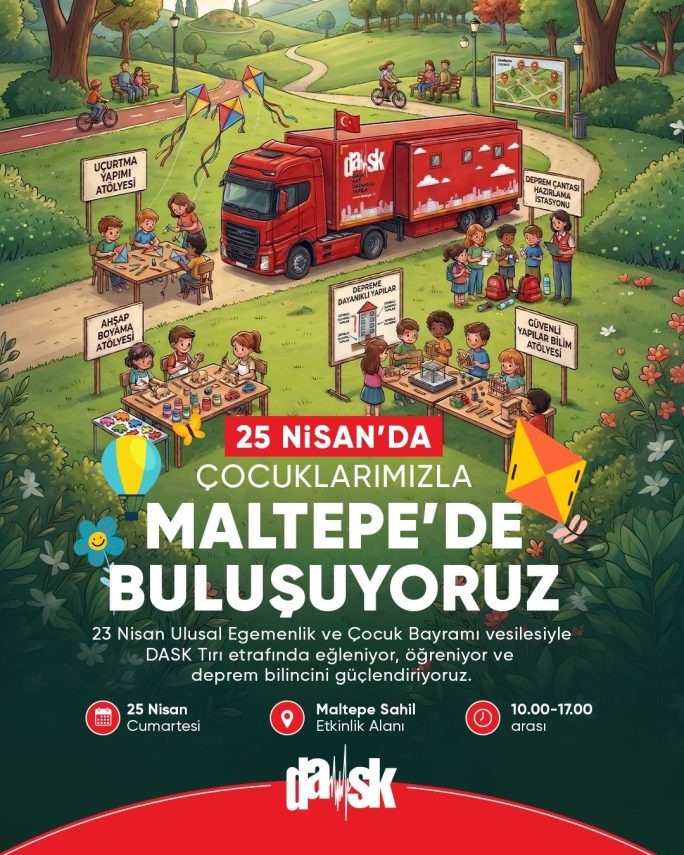 Doğal Afet Sigortaları Kurumu (DASK), 23 Nisan Ulusal Egemenlik ve Çocuk Bayramı kapsamında İstanbul Maltepe Sahili’nde çocuklara yönelik farkındalık etkinliği düzenliyor. 25 Nisan Cumartesi günü saat 10.00 ile 17.00 arasında Maltepe Sahil Etkinlik Alanı’nda gerçekleştirilecek etkinlikte, çocuklar ve aileler bir araya gelecek.