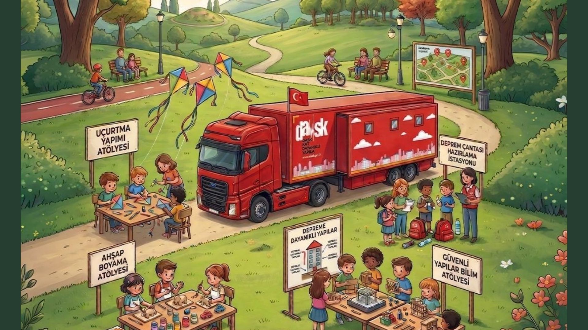 “DASK Tırı” etrafında kurulacak atölyelerle gün boyu devam edecek. Programda uçurtma yapımı, ahşap boyama, deprem çantası hazırlama ve güvenli yapılar temalı uygulamalar yer alacak.