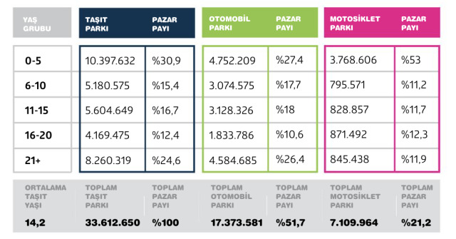 Gülhan’ın paylaştığı veriler Türkiye otomotiv ekosistemine dair daha derin bir gerçeği ortaya koyuyor: Türkiye’deki otomobillerin yüzde 55,5’i 11 yaş ve üzeri. Toplam 17,3 milyonluk otomobil varlığı içinde ise tablo şu şekilde: