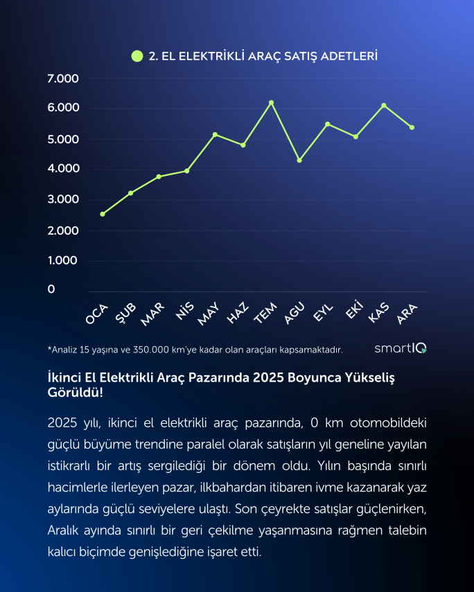 2025 yılı, ikinci el elektrikli araç pazarı açısından da istikrarlı bir büyüme yılı oldu. Yılın başında sınırlı hacimlerle ilerleyen satışlar, ilkbahar aylarından itibaren ivme kazanarak yaz aylarında güçlü seviyelere ulaştı. Son çeyrekte satışlar güçlenirken, Aralık ayında sınırlı bir geri çekilme yaşansa da rapor, talebin kalıcı biçimde genişlediğine işaret etti.