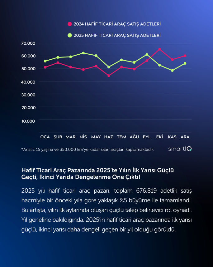 Hafif ticari araç pazarı 2025 yılında toplam 676.819 adetlik satış hacmiyle bir önceki yıla göre yaklaşık %5 büyüme kaydetti. Bu artışta yılın ilk aylarında oluşan güçlü talep belirleyici olurken, yılın ikinci yarısında daha dengeli bir seyir izlendi.