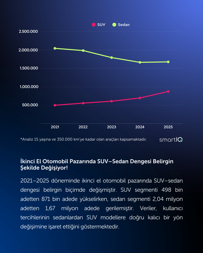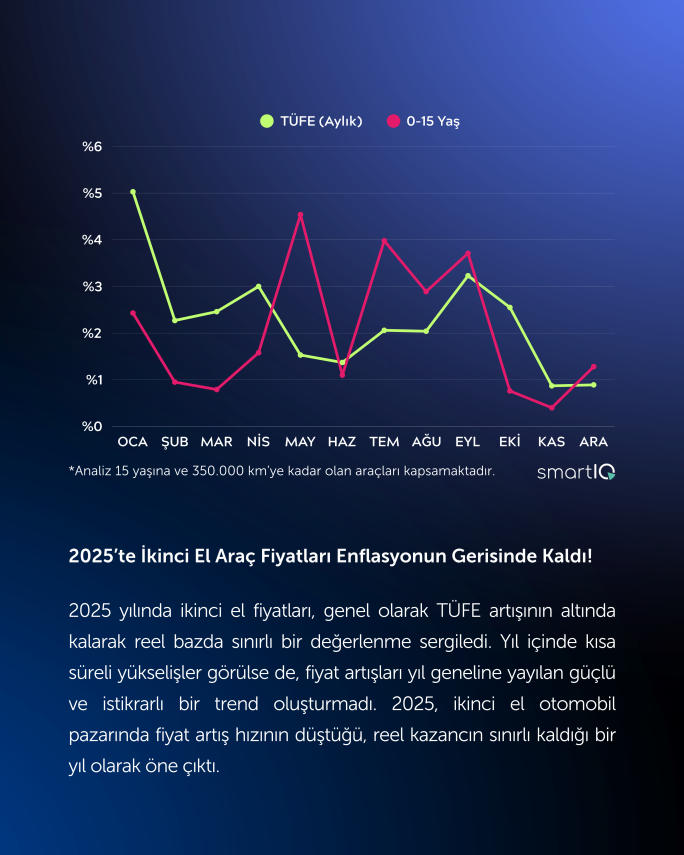 İkinci el pazarda ise 15 yaş ve 350 bin kilometreye kadar olan segmentte satışlar yıl genelinde yüzde 7 artış gösterdi. Düşük fiyat seviyelerinin etkisiyle SUV ile B-C-D-E segmentlerindeki ikinci el araç fiyatlarının, TÜFE artışının belirgin biçimde altında kaldığı gözlendi.