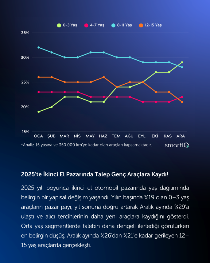 2025 boyunca ikinci el pazarında araç yaş dağılımında belirgin bir dönüşüm yaşandı. Yılın başında %19 olan 0–3 yaş araçların pazar payı, Aralık ayında yüzde 29’a yükseldi. Bu eğilim, alıcı tercihlerinin daha genç araçlara kaydığını gösterdi. Orta yaş segmentlerde talep daha dengeli seyrederken, en belirgin düşüş 12–15 yaş araçlarda yaşandı; bu grubun payı Aralık ayında yüzde 26’dan yüzde 21’e geriledi.