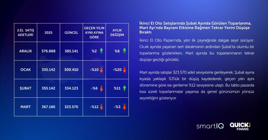 Quick Finans’ın SmartIQ iş birliğiyle yayımladığı 2. El Oto Raporu’nun Mart 2026 verileri, otomotiv sektöründe dengelerin henüz netleşmediğine işaret etti. Rapora göre, hem sıfır araç hem de ikinci el pazarında ekonomik koşullar ve jeopolitik gelişmeler etkisini sürdürdü.