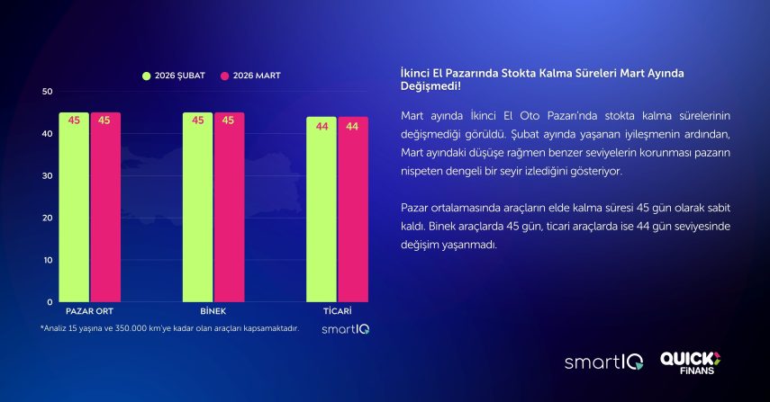 Mart ayında ikinci el araçların stokta kalma süresinde önemli bir değişiklik yaşanmadı. Ortalama elde kalma süresi 45 gün seviyesinde sabit kaldı. Binek araçlarda bu süre 45 gün olurken, hafif ticari araçlarda 44 gün olarak kaydedildi. Bu görünüm, satışlardaki gerilemeye rağmen piyasada belirli bir dengenin korunduğunu ortaya koydu.